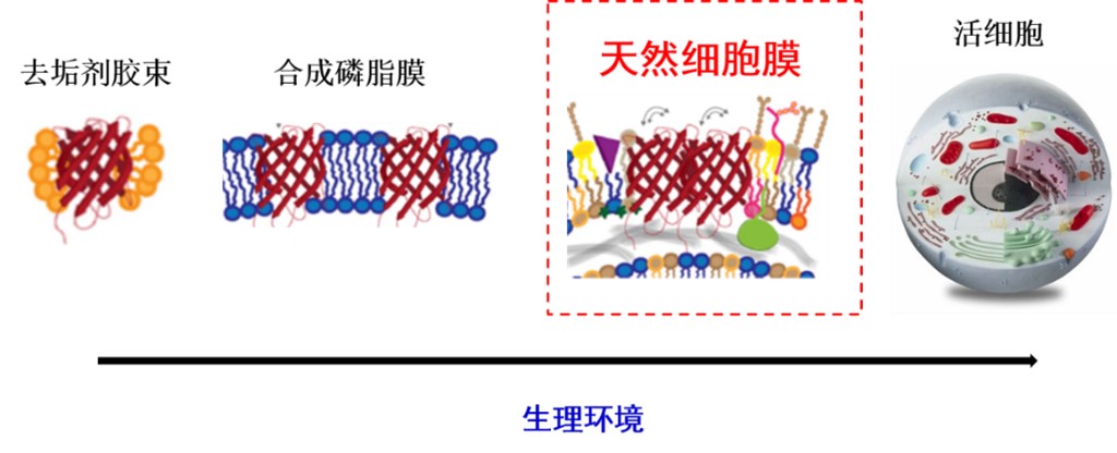 膜蛋白在高度异质和复杂的细胞膜环境中行使功能。细胞膜的组成以及物理化学性质对膜蛋白的结构和功能有重要的影响,因此准确地阐明膜蛋白在天然细胞膜环境中的结构对于理解其真实的功能机制至关重要。但是在天然细胞膜中测定膜蛋白的结构面临着诸多挑战,这主要是因为天然细胞膜系统的高度不均匀性、复杂的背景信号干扰以及目标蛋白的低丰度限制了常用结构分析技术的检测分辨率和灵敏度。因此迄今为止,蛋白质数据库中几乎所有可用的膜蛋白结构均是在体外简化的膜模拟物(如去垢剂胶束、 纳米盘和合成磷脂膜等)中得到(图2)。然而,这些膜模拟环境均很难模拟出天然细胞膜独特的理化特性,如细胞膜的疏水厚度、侧压、化学梯度、电场梯度等,这些理化特性的差异可能会对膜蛋白的结构和功能产生影响。此外,在这些样品制备过程中需要将膜蛋白从其原生的细胞膜环境中提取出来,再重组到膜模拟环境中,这可能会导致蛋白质的结构改变或活性丧失。因此,在天然的细胞膜环境中测定膜蛋白结构是一个非常重要但极具挑战性的课题。