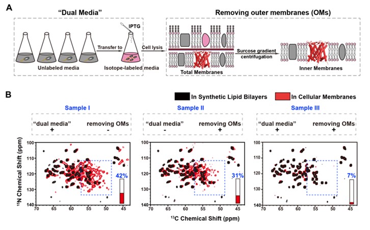 背景蛋白信号的干扰一直是利用固体NMR测定天然细胞膜中膜蛋白三维结构的一个主要障碍。研究团队结合各种抑制背景蛋白表达和标记的技术,包括优化蛋白表达条件、菌株筛选、“双培养基”以及内外膜分离等,提出了一种改进的样品制备方案(图3)。该方案可以实现背景蛋白信号的完全抑制,同时保持目标蛋白的高灵敏度。