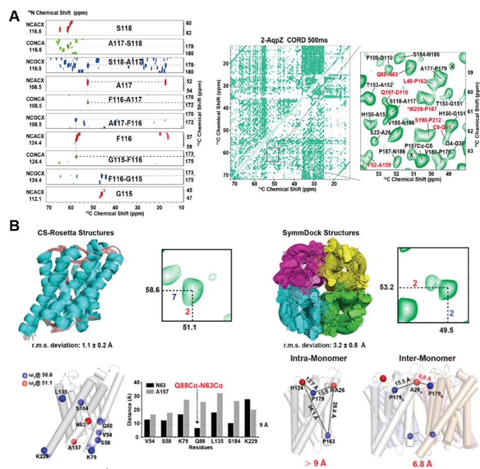基于上述结构测定方法,研究团队成功地在天然细胞膜中测定了水通道蛋白AqpZ的结构,其骨架均方根偏差(RMSD)为1.7 0.4 ?。这是国际上首次利用固体NMR在天然细胞膜中实现膜蛋白高分辨率三维结构的测定。这项研究证明了固体NMR在天然细胞膜环境中测定膜蛋白高分辨率三维结构的可行性和巨大潜力,对于结构生物学领域具有重要意义。