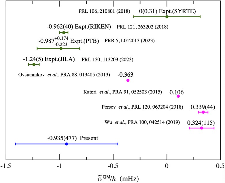 Sr光钟魔幻波长处动力学E2-M1极化率之差的比较。绿色的代表实验测量值,水红色的代表以前的理论结果,蓝色的代表包含负能态之后的理论结果