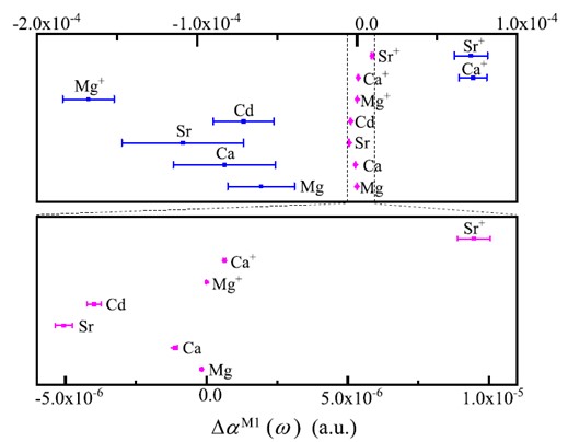 负能态对其它光钟体系M1极化率之差的贡献。水红色的代表仅含正能态的结果,蓝色的代表包含负能态的理论结果