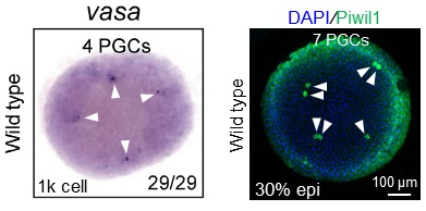 图1 斑马鱼等鱼类早期胚胎中仅存在极少数目的PGC