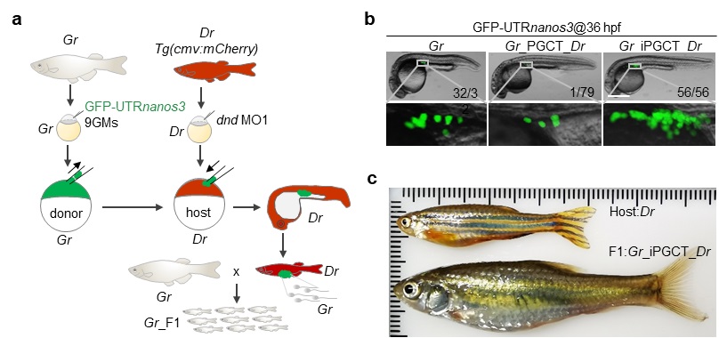 图3 稀有鮈鲫iPGC的高效诱导和iPGC移植种间借腹生殖