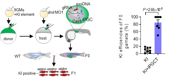 最后,作者试图利用iPGC诱导和移植技术来解决鱼类基因敲入实验中面临的一个致命难题——即基因敲入效率与胚胎存活率之间的矛盾。作者注射大剂量的基因敲入元件,以在囊胚期获得尽可能高的基因敲入效率;通过注射9GM,将这些携带有大量基因敲入事件却无法存活的胚胎细胞全部诱导为iPGC;再将这些iPGC移植入野生型受体胚胎,最终利用高存活率的野生型受体鱼高效产生出了基因敲入的配子(图4)。基因敲入与iPGC诱导结合实验的成功,从根本上提升了斑马鱼基因敲入实验中的种系传递效率。