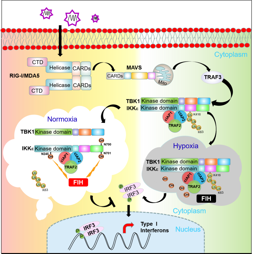 通过前期的筛选,研究人员发现酶活与氧浓度密切相关的FIH能够与先天免疫信号通路中的IKK 相互结合。过表达FIH减弱了IRF3的磷酸化水平,同时显著抑制先天免疫信号通路下游基因的表达,以及促进了病毒的复制;而当在细胞系敲除FIH,可得到相反的实验结果,表明FIH负调控病毒诱导的先天免疫信号通路。