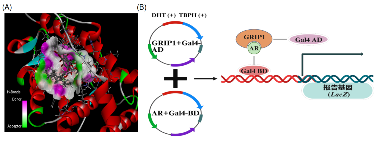 图1 (A)TBPH与AR的对接构象;(B)TBPH抑制DHT诱导的报告基因表达