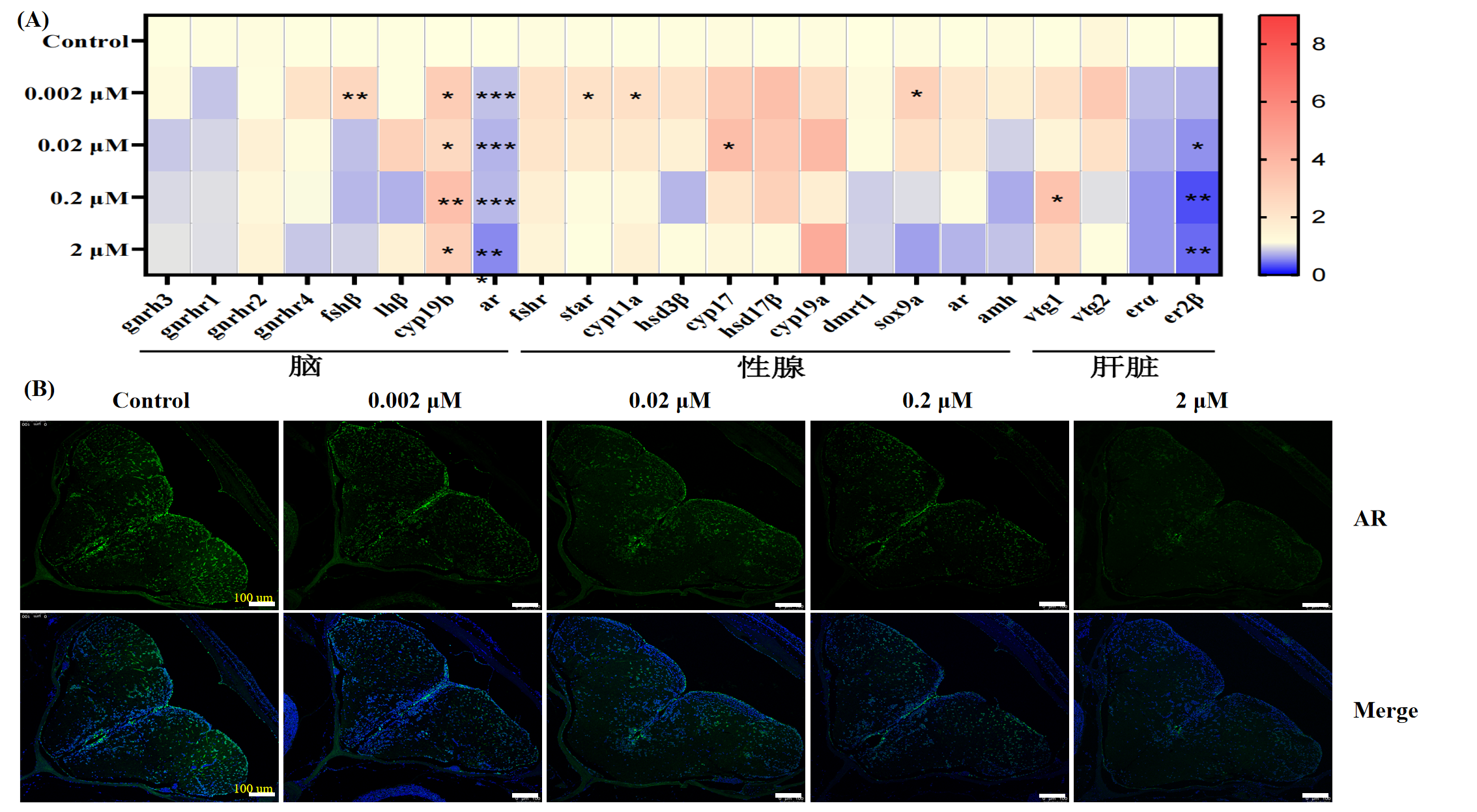 图3 TBPH对(A)HPG轴基因转录谱和(B)端脑AR表达的影响