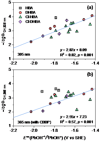 图1 模型化合物的三线态单电子氧化电位与 OH量子产率之间的关系