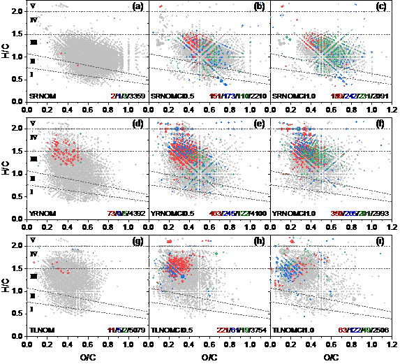 图2 氯化前后三类DOM样品的van Krevelen图(灰色点表示CHO(N,S)分子,红色、蓝色和绿色点分别代表含一氯、二氯和三氯取代的分子)