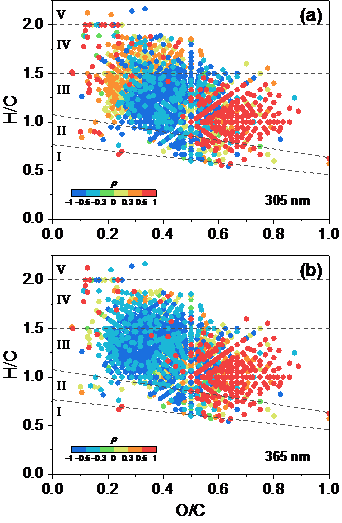 最后,研究人员测定了氯化前后DOM在305 nm和365 nm LED照射下的 OH量子产率,发现随着有效氯投加量增加,氯化后DOM的 OH量子产率增大,且SRNOM的增幅大于YRNOM和TLNOM;Spearman秩相关性分析发现,DOM中富含酚羟基和羧基的分子(O/C > 0.5, H/C < 1.5)是 OH的主要来源(图3)。以上结果证实,DOM氯化产生的氯代酚类化合物,尤其是富含氧的分子,可显著增强光致 OH的生成能力。