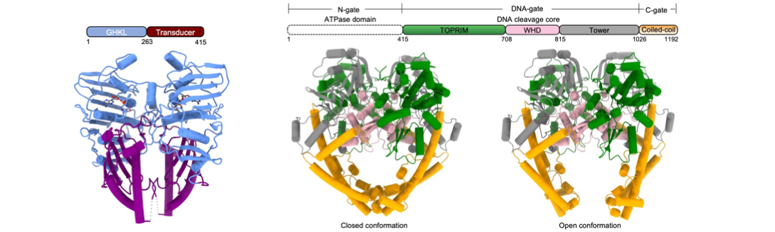 DNA拓扑异构酶广泛存在于古菌、原核生物、真核生物和一些核质大DNA病毒中,在基因复制、转录、重组和染色体分离过程中发挥着重要作用,是多种抗肿瘤药物和抗菌药物的靶标。II型拓扑异构酶利用水解ATP产生的能量催化DNA双链的断裂和结合,从而调控DNA的拓扑状态。尽管氨基酸序列同源性较低,几乎所有的II型拓扑异构酶都具有两个保守的功能域:位于蛋白N端的ATPase结构域和紧随其后的DNA结合与切割结构域。研究表明,II型拓扑异构酶可以通过结构域间的变构调节控制多个催化步骤,包括DNA结合、ATP水解和DNA链传递过程。然而,结构域之间的分子偶联机制尚不清楚。