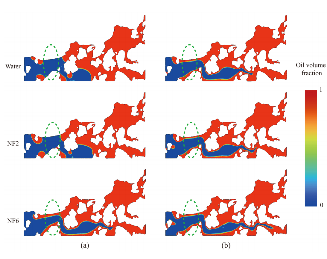 针对这一问题,中国科学院武汉岩土力学研究所二氧化碳地质封存研究团队通过室内试验及计算流体力学方法进行深入研究。实验结果表明,纳米流体能够降低水—油之间的界面张力,同时可将储层由中性润湿变为强亲水性润湿。相对于水驱,纳米流体驱能更为有效地驱替大孔和小孔中的油,并且与CO2协同作用时能够实现更高的采收率。数值模拟显示驱替流体驱油过程可分为初始通道建立阶段和通道扩张阶段。在初始阶段,纳米流体的运移前缘更快也更尖锐,并未表现出提高采收率的效果;在通道扩张阶段,纳米流体能够驱替相对“死孔隙”赋存的油,并显著提高采收率。