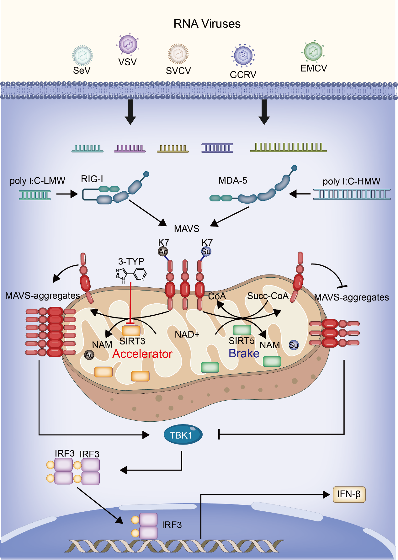 在此基础上,他们进一步发现,MAVS蛋白不仅存在琥珀酰化修饰,还存在乙酰化修饰,并且琥珀酰化修饰和乙酰化修饰发生在MAVS蛋白的同一个位点(第7位赖氨酸)。同属于Sirtuin蛋白家族的另一个成员SIRT3可以去除MAVS蛋白的乙酰化修饰,增强MAVS蛋白的多聚化和对下游信号通路的激活,从而诱导干扰素等抗病毒基因的表达,进而增强机体抵御RNA病毒感染的能力。在体实验表明:sirt3敲除的斑马鱼其抵御草鱼呼肠孤病毒(GCRV)和鲤春病毒血症病毒(SVCV)感染的能力显著降低。他们进一步利用小鼠模型证实了SIRT3的这一调控机制在脊椎动物中的功能保守性。当同时敲除Sirt3和Sirt5后,体内抗病毒基因的表达水平、机体的抗病毒能力恢复到野生型同样的水平。基于此,他们提出了MAVS蛋白活性调节的一个“油门”和“刹车”作用模型:SIRT3通过去除MAVS蛋白的乙酰化修饰,激活MAVS,起到了“油门”的作用;而SIRT5通过去除MAVS蛋白的琥珀酰化修饰,抑制MAVS活性,起到了“刹车”的作用。SIRT3和SIRT5介导的两种去酰基化修饰相互协调、相互制约,在RNA病毒感染机体时,既可以快速响应,激活抗病毒天然免疫反应,又可以避免机体天然免疫反应的过度激活而对机体造成损伤。