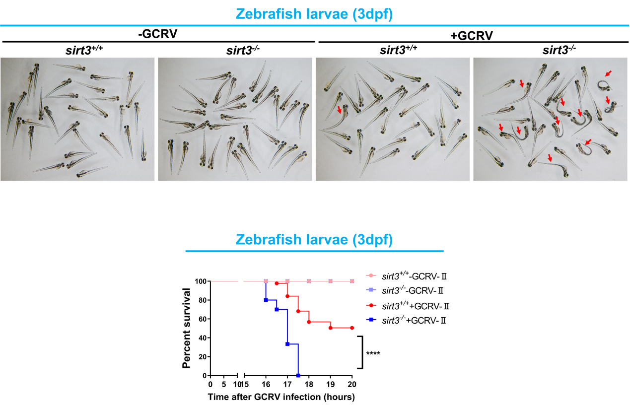 中国科学院水生生物研究所肖武汉研究员团队前期利用多组学技术,筛选到一系列调控鱼类抗病毒天然免疫反应的重要因子,其中包括去琥珀酰化酶SIRT5。他们发现:SIRT5可以通过去除MAVS蛋白的琥珀酰化修饰,抑制干扰素等抗病毒基因的表达;sirt5缺失的斑马鱼在生长、发育和繁殖等方面与野生型斑马鱼相比无明显差异,但是其抗RNA病毒感染的能力显著增强(Liu et al.,EMBO Journal,2020;Chen et al.,Journal of Immunology,2022)。