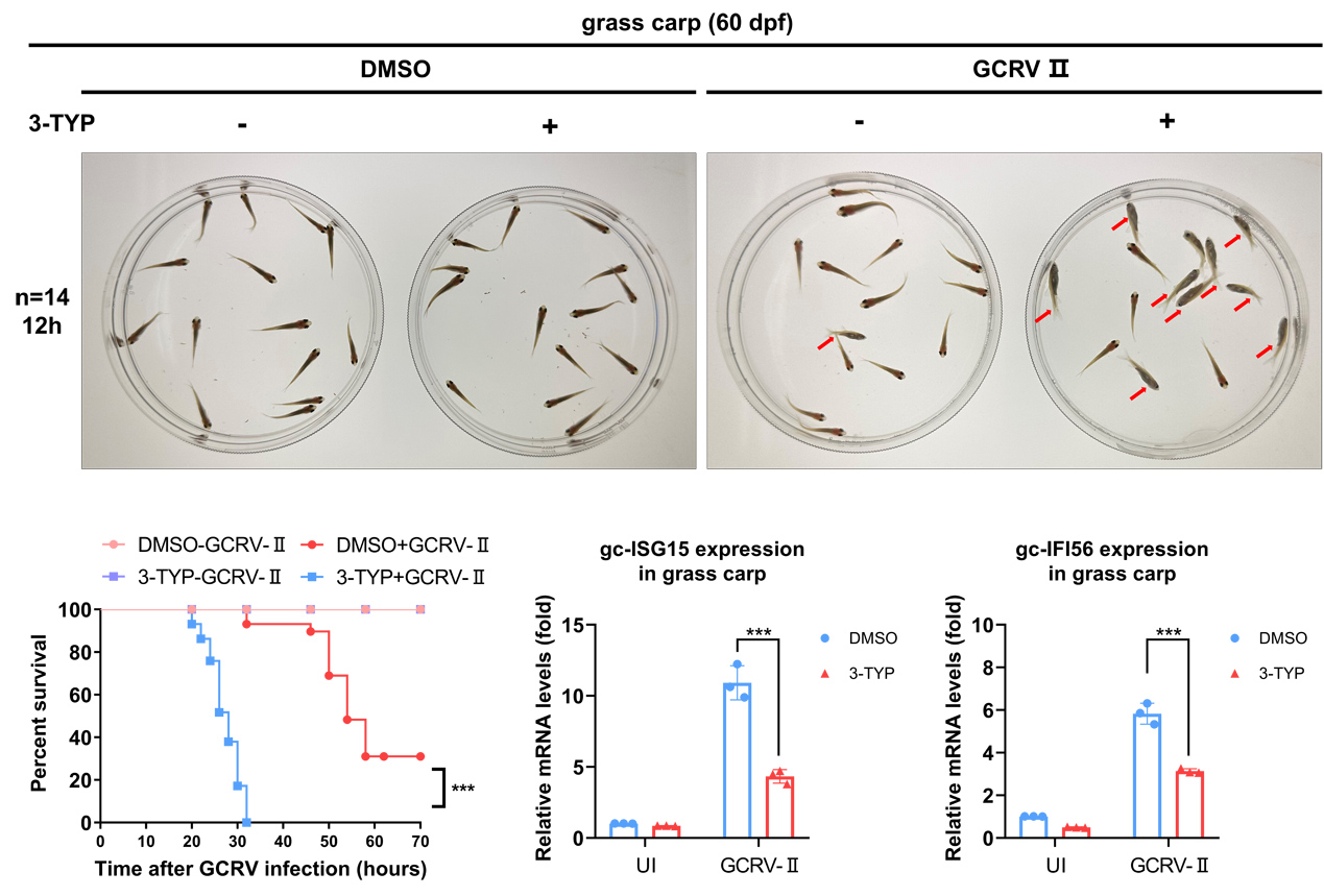 此外,该团队还以草鱼为研究对象,进一步阐释了SIRT3在草鱼抵御草鱼呼肠孤病毒感染中的重要作用。他们发现:抑制SIRT3的活性将同样显著降低草鱼抗草鱼呼肠孤病毒感染的能力,这为培育草鱼抗呼肠孤病毒感染新品种提供了重要的分子标记。近日,相关的研究工作发表在Aquaculture上,朱纯纯特别研究助理为该文第一作者,肖武汉研究员和刘兴副研究员为共同通讯作者。