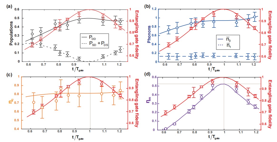 为了验证纠缠在量子引擎中的作用,研究人员通过调整工作物质的纠缠度来定量评估量子引擎的性能。实验中,研究人员通过精准操控激光来控制纠缠逻辑门操作的时间,由此获得不同纠缠度的工作物质。同时,通过测量工作物质中被吸收的光子数和负载中增加的声子数,研究人员得到了不同纠缠度下的转换效率和机械效率,如图一所示。实验表明,机械效率的最大值出现在工作物质为最大纠缠处,但转换效率几乎不受纠缠度的影响。针对实验数据的进一步分析表明,量子引擎在其工作物质处于纠缠态时能输出更多的有用功;而量子引擎的转换效率与纠缠无关,也与有用功的输出无关。