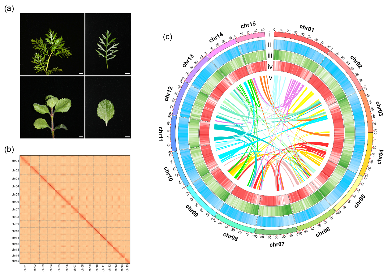 (a)水陆生境下的异叶水蓑衣植株和叶形;(b)异叶水蓑衣染色体的Hi-C互作;(c)异叶水蓑衣的基因组信息总览