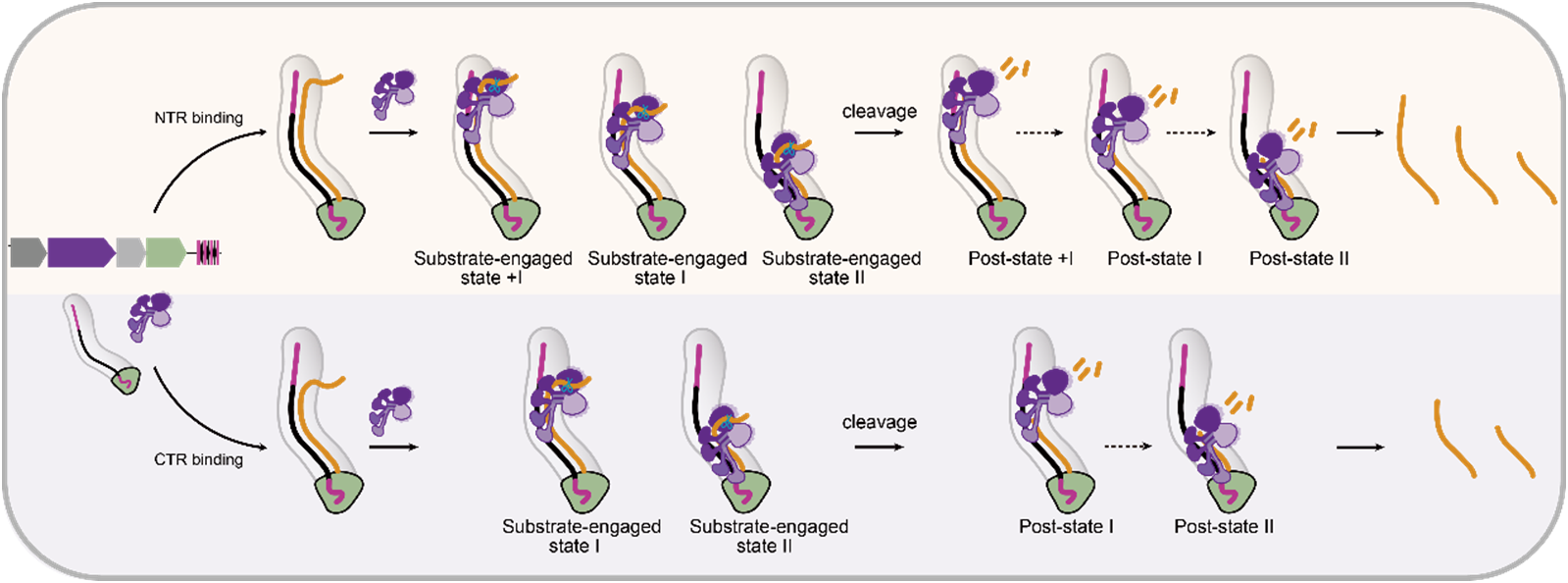 为阐明VII型系统切割底物RNA的分子机制,并进一步探究其应用于基因编辑的可能性,合作团队对VII型系统复合体进行了生化表征及结构解析。该研究有以下主要发现:1. VII型系统复合体由7个Cas7蛋白、1个Cas5蛋白、4个Cas14蛋白以及crRNA和底物RNA构成;2. VII型系统通过一种独特的核酸酶Cas14四聚体特异性切割底物RNA;3. 底物靶序列两侧的序列 (protospacer flanking sequence ,PFS) 的存在往往限制了CRISPR工具对靶点的选择性,VII型系统的3’-PFS对底物切割无影响,而5’-PFS则可以通过增加VII系统复合体中Cas14的结合位点影响对RNA底物的切割。综上,该研究首次对VII型CRISPR-Cas系统的功能进行了表征,深入阐明了这一系统独特的组装机制、底物RNA识别和切割模式,为基于VII型CRISPR-Cas系统的RNA操控工具的设计与开发奠定了基础。