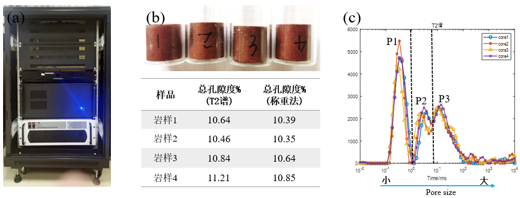 图5 一体化磁共振波谱仪及测试结果:(a)试验仪器;(b)红砂岩孔隙度测试结果;(c)红砂岩T2谱测试