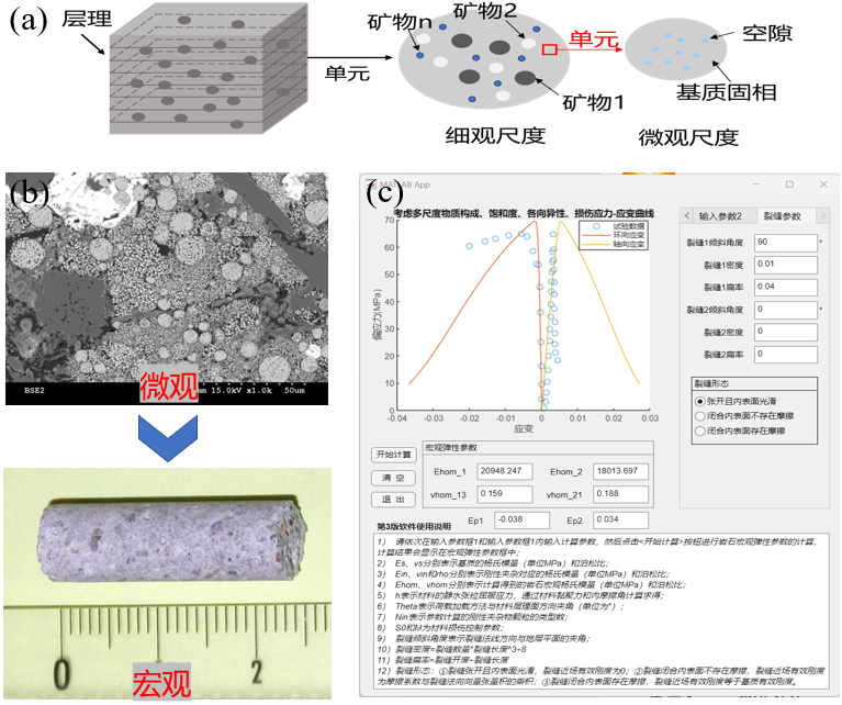 图7 均匀化岩石数值实验方法:(a)均匀化方法示意;(b)岩石微观-宏观尺度效应对比;(c)升尺度损伤应力-应变反演软件界面