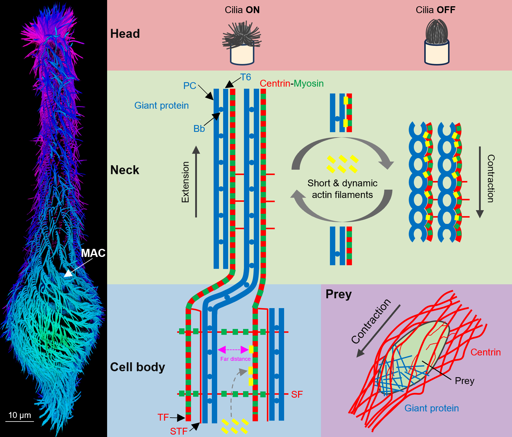 真核细胞依赖形态的动态变化来执行多种功能,以维持基本生物过程并调控细胞行为。单细胞捕食性原生动物——长吻虫,其形态与天鹅相似,其中常见种天鹅长吻虫(Lacrymaria olor)因此得名。长吻虫细胞在结构上可划分为三个部分:从后端到前端依次为胞体、“颈部(脖子)”和“头部(口器)”。长吻虫通过不断伸缩其细胞颈来搜索和捕捉猎物,在这一过程中,颈部可以延伸至胞体长度的30倍之多,展现出极致的动态形态变化。这种细胞极致动态形变背后所蕴含的分子材料仍然未知。