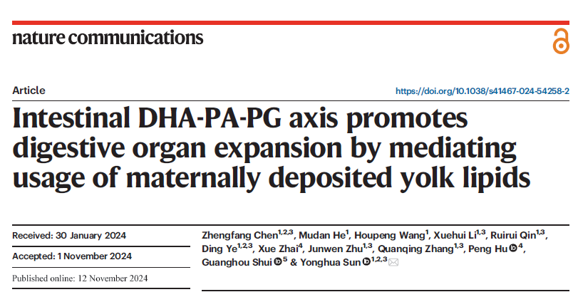 2024年11月12日,孙永华团队在国际学术期刊Nature Communications上发表了题为“Intestinal DHA-PA-PG axis promotes digestive organ expansion by mediating usage of maternally-deposited yolk lipids”的研究论文。该论文利用斑马鱼模型,发现eeNST阶段的胚胎原始肠道中存在一个“DHA-PA(磷脂酸)-PG(磷脂酰甘油)轴”,其调控了母源脂质的吸收利用并促进内胚层器官的扩张,从而协助胚胎顺利完成eeNST转换。