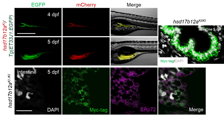 图1. Hsd17b12a特异表达于原始肠道上皮细胞且定位于内质网