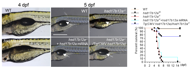进一步,他们利用CRISPR/Cas9技术构建了hsd17b12a敲除品系,发现hsd17b12a缺失导致原始肠道的LC-PUFA合成缺陷,最终引起胚胎卵黄吸收不全且鱼鳔充气障碍,全部死亡,无法顺利度过eeNST转换(图2)。研究团队发现突变体原始肠道的结构和功能都出现障碍,且其消化器官外分泌胰腺和肝脏的扩张显著受阻,hsd17b12a突变导致卵黄脂质堆积的主要原因是卵黄脂质向原始肠道的转运受阻。