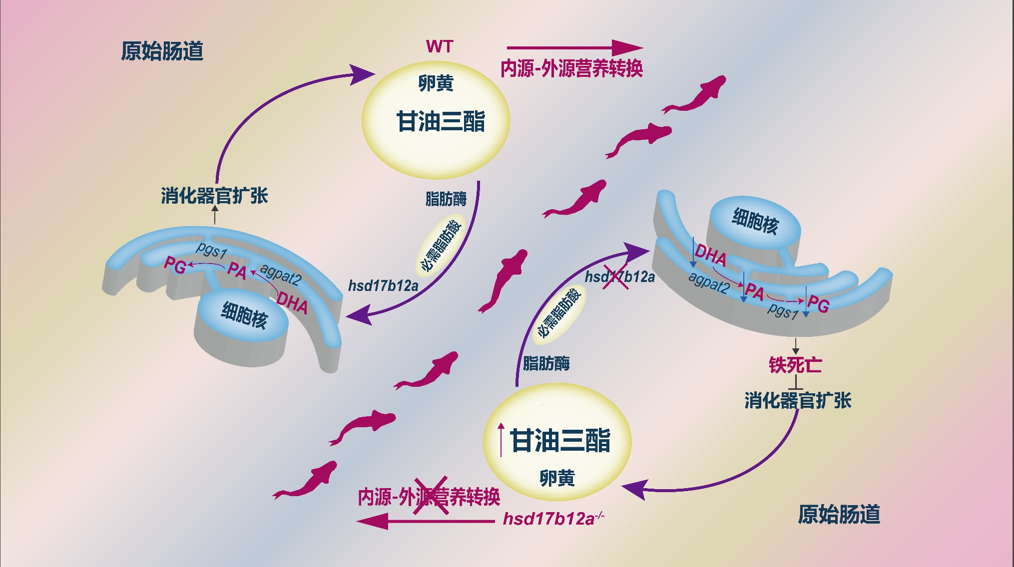 为了进一步探讨原始肠道脂质代谢在消化器官扩张缺陷及铁死亡的作用机制,研究者对hsd17b12a突变体和WT进行了脂质组学分析,结果发现原始肠道中存在一条DHA-PA-PG代谢轴。通过一系列拯救实验,研究者发现DHA-PA-PG轴受损是肠道铁死亡和消化器官扩张受阻的重要原因。该研究揭示了胚胎原始肠道中DHA-PA-PG轴调控母源脂质利用和消化器官扩张的新机制,hsd17b12a突变导致DHA-PA-PG轴受损和胚胎内源-外源营养转换(eeNST)失败(图3)。