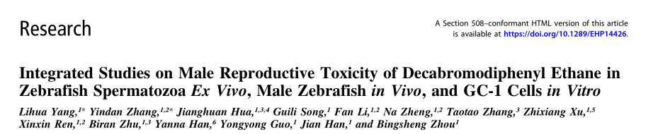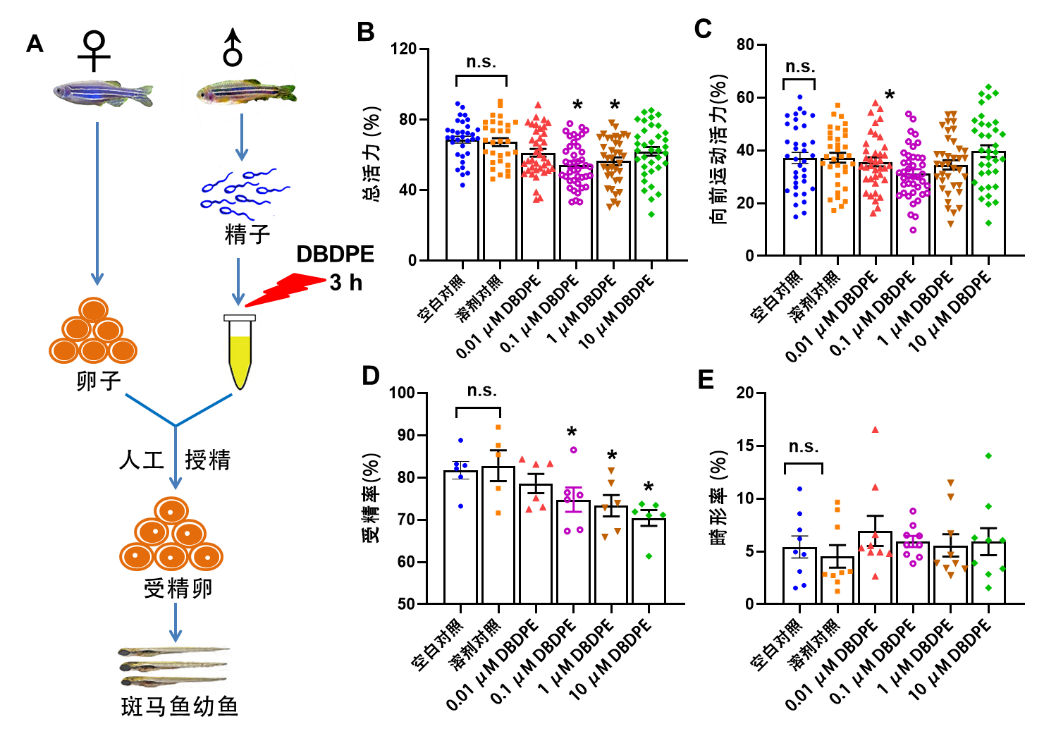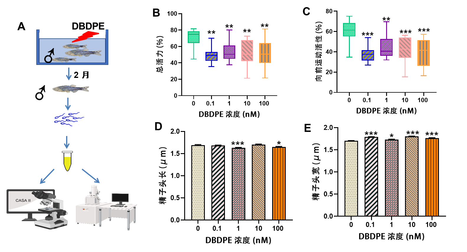 中国科学院水生生物研究所环境毒理学研究组周炳升团队利用体外精子快速筛选(ex vivo)、活体斑马鱼暴露(in vivo)和离体细胞验证(in vitro)等多种研究手段,证实了DBDPE暴露可影响精子活力,并首次发现环境污染物可能通过诱导精巢能量重编程过程引起雄性生殖功能障碍。