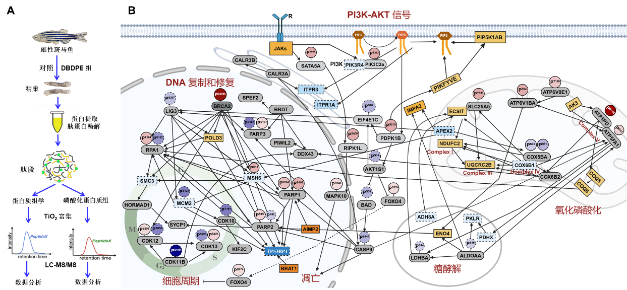 图3 DBDPE活体暴露后精巢的全蛋白质组学和磷酸化蛋白质组学分析。(A)组学流程;(B)100 nM DBDPE组精巢的蛋白质相互作用网络图。