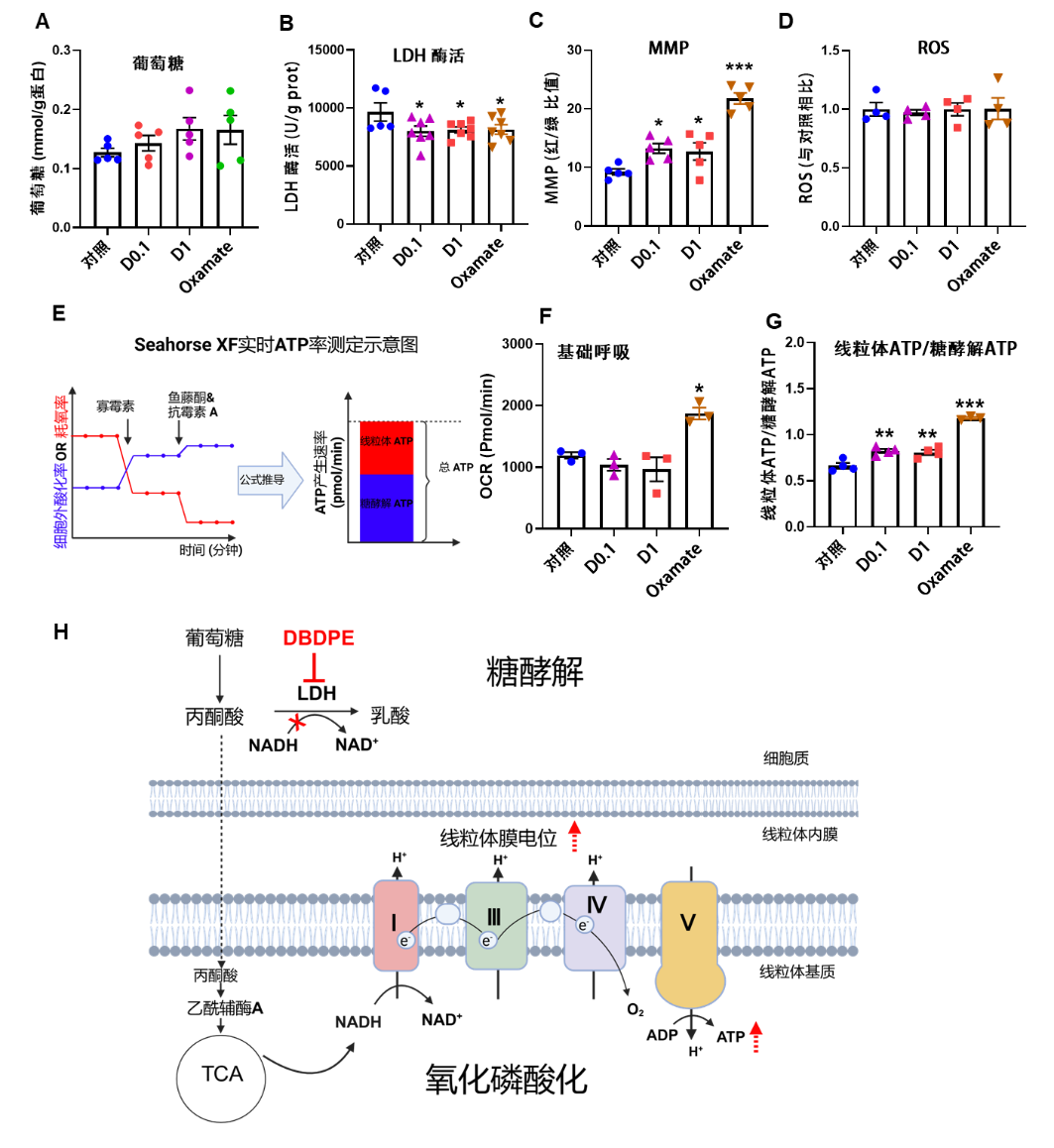 图4 小鼠精原细胞GC-1在DBDPE和Oxamate (LDH抑制剂)暴露后的能量代谢水平。GC-1细胞的(A)葡萄糖含量; (B) LDH活性; (C)线粒体膜电位MMP; (D) ROS水平; (E)Seahorse XF实时ATP率测定示意图;细胞的 (F)基础呼吸 (G)线粒体氧化磷酸化ATP(mitoATP)/糖酵解ATP (glycoATP)的比例。 (H)基于体外和体内研究结果提出DBDPE对糖酵解和氧化磷酸化的作用。