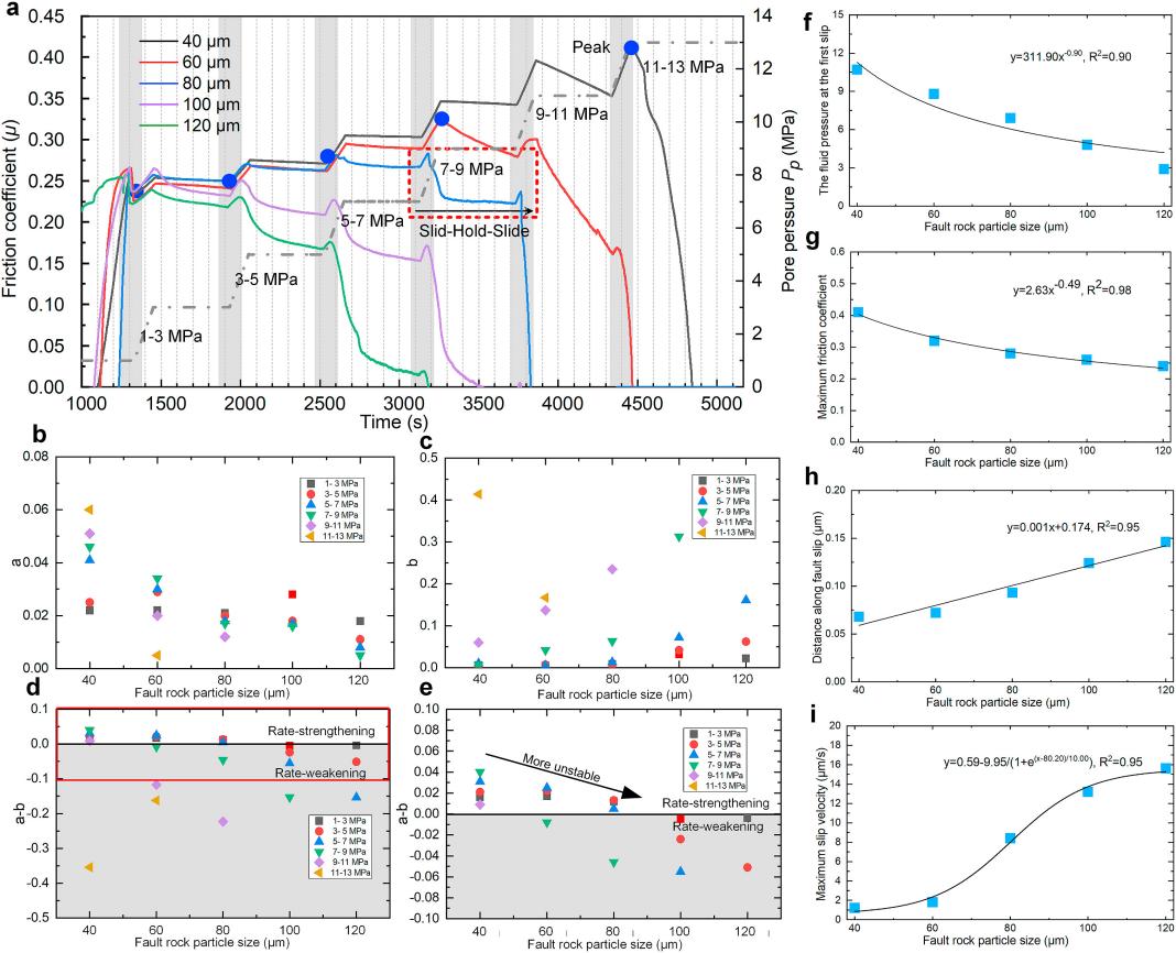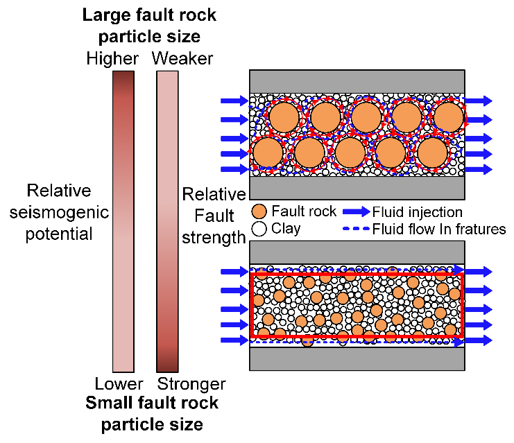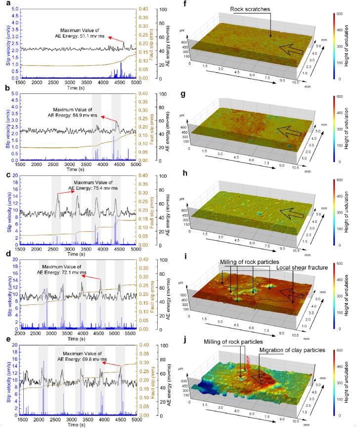 基于此背景,中国科学院武汉岩土力学研究所地下工程科研团队康永水等研究人员开展了室内试验和渗流力学的相关研究,主要研究成果如下:(1)开展了流体作用下含断层泥断层诱导滑移的三轴剪切渗流实验,研究了断层泥对断层滑移力学行为以及摩擦稳定性的影响,揭示了泥质充填节理剪切强度及剪切滑移机制;(2)研究了断层泥岩石粒径对断层滑移速度依赖特性的显著影响。结果表明,断层泥岩石粒径控制着断层滑移事件的发生,并且初始断层滑移所需的流体压力与岩石粒径呈负相关。并深入研究了水力耦合下断层泥诱导断层滑移破裂的微观机制,为深部软岩大变形灾害防控方法的研究提供了新的思路;(3)研究了断层带充填物含水率对粘土充填岩节理的抗剪强度的影响。研究发现当含水量超过塑性极限时岩石节理的抗剪强度呈负相关趋势,基于 JRC-JCS 强度准则,提出了富粘土填充岩石节理的剪切强度模型。