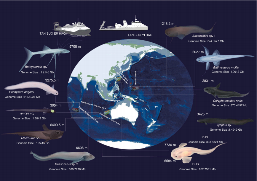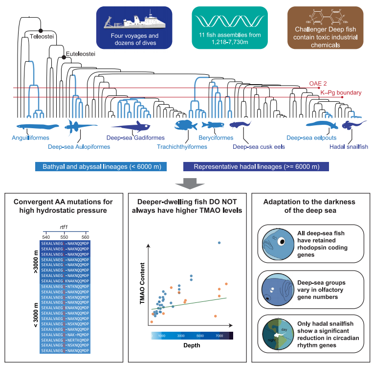 近日,中国科学院水生生物研究所、中国科学院深海科学与工程研究所何舜平团队在深渊鱼类适应性领域取得新进展。研究构建了环太平洋深渊鱼类基因组资源库,系统且全面揭示了脊椎动物突破高压生存禁区的适应性重塑和演化轨迹。研究还显示人类活动已经对深渊环境造成了污染。研究成果以“Evolution and genetic adaptation of fishes to the deep sea (鱼类对深海的进化和遗传适应)”为题,3月6日在线发表于《细胞》(Cell)。