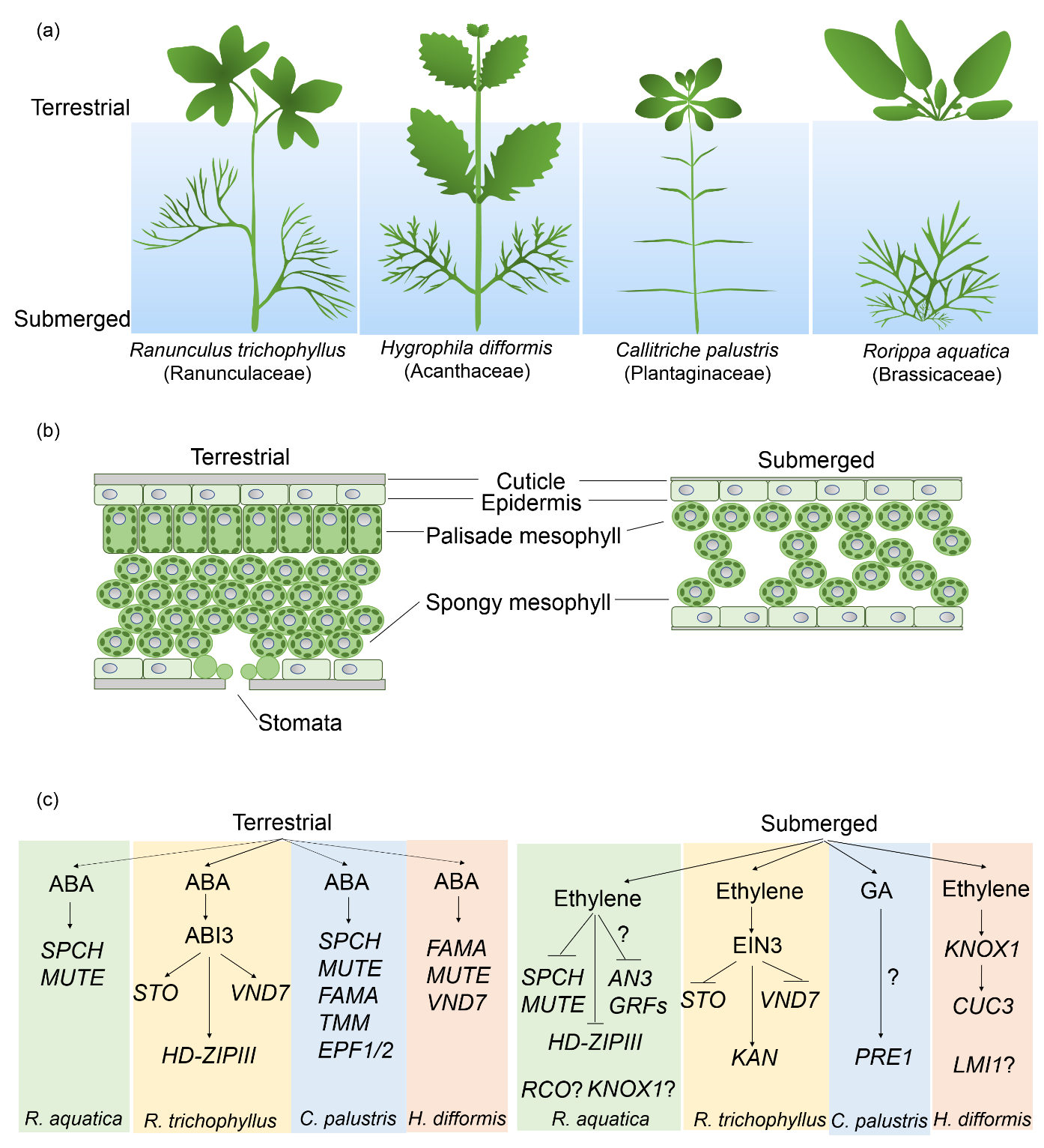 (a)异形叶代表物种的表型;(b)水陆生境下异形叶的结构变化;(c)水生植物异形叶调控的分子机制