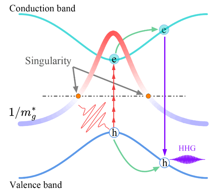 粒子的质量反映了其在外力作用下的响应能力,在非相对论框架下其质量保持恒定不变。而在晶体中,电子以周期性的布洛赫波的本征形式存在,同时其波包在外场中的运动又表现出粒子属性。激光作用下的电子与空穴的有效质量则由其携带的晶格动量及所在能带的色散关系共同决定,其数值非恒定且可以覆盖整个实数域。有趣的是,有效质量在从正值变为负值时,并非逐渐过渡,而是通过正无穷突变为负无穷,出现所谓的“有效质量奇点”。然而,在过往关于固体中电子超快动力学和高次谐波辐射的研究中,这一重要物理量往往被忽略。