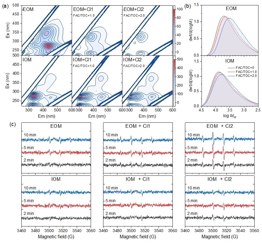 图1 (a)氯化前后AOM的荧光EEM光谱;(b)氯化前后AOM的分子量分布;(c)氯化前后AOM中•OH的DMPO自旋捕获ESR波谱