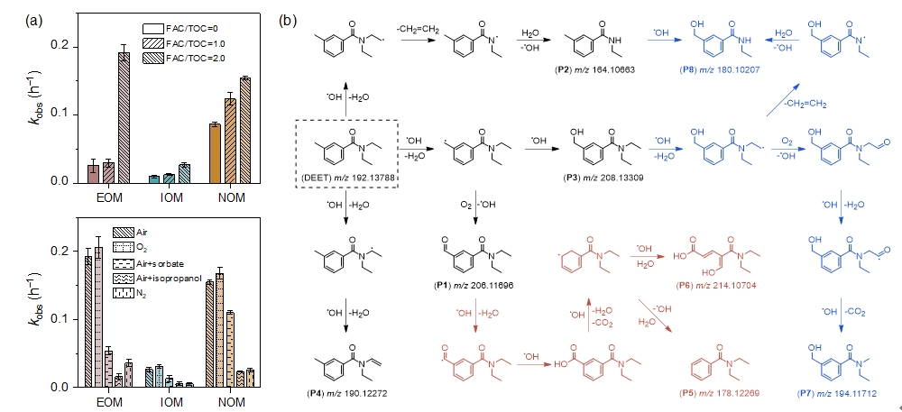 图2 (a)DEET在不同条件下氯化前后AOM和NOM溶液中的光降解速率常数;(b)DEET在氯化前后EOM中的光降解途径