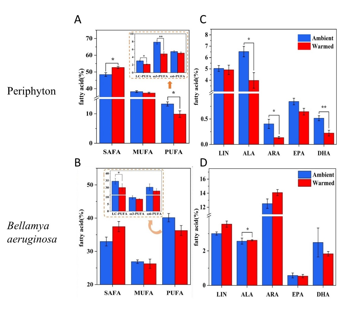 中国科学院武汉植物园系统生态学研究组硕士生钱正禄,在谭香研究员和张全发研究员的指导下,通过开展中宇宙实验,研究升温(升高4°C)如何影响基础资源附石生物脂肪酸组成及向消费者的传递。 结果表明:变暖导致PUFA和长链PUFA(LC-PUFA, >20 C)在附石生物中的比例分别从 13.32%降低到9.90%,以及从3.05%显著降低到 2.18%。三种PUFA 的比例——α-亚麻酸(ALA, 18:3ω3)、花生四烯酸(ARA,20:4ω6)和二十二碳六烯酸(DHA, 22:6ω3)的比例也显著下降(p<0.05)。初级消费者的脂肪酸谱反映了基础资源的变化,其pufa从40.14%>