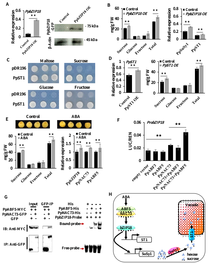 本研究还发现,脱落酸(ABA)处理可导致PpbZIP18表达量显著增加,但PpbZIP18启动子区缺乏典型的ABA响应元件ABRE。通过酵母单杂交筛库,发现一个受ABA诱导的NAC转录因子PpNAC73能够结合到PpbZIP18的启动子上,从而激活其表达。同时,PpNAC73可与ABRE转录因子PpABF5互作,协同调控PpbZIP18的转录(图1)。综上,本研究揭示了ABA信号介导PpNAC73/PpABF5-PpbZIP18模块调控桃果实蔗糖积累的分子机制。