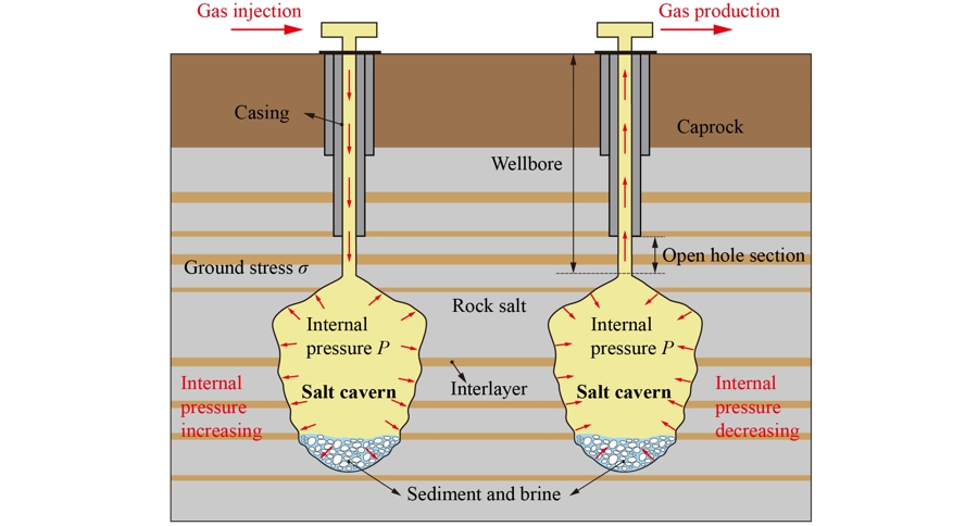 在盐岩层中建设盐穴储气库与压缩空气储能电站是我国地下储能领域重点发展方向。在盐穴储气库和压气储能电站运行过程中,随着注采作业的进行,盐穴内部压力呈现周期性升降变化,导致围岩长期承受循环载荷作用(图1)。当前岩石蠕变试验机主要可分为电液伺服蠕变试验机和重力加载蠕变试验机。前者在开展长期蠕变试验时,易受到断电和电子元器件损坏等影响导致试验中断或失败,后者一般只能实现恒定的单轴加载,难以提供连续变化的三轴循环荷载,两种类型的蠕变试验机在开展低频率循环加载蠕变试验时都有明显的局限性。因此,研发新型蠕变试验系统已迫在眉睫。