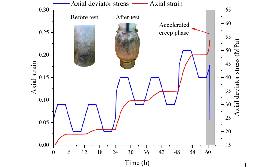 利用该试验系统开展了周期为1天和7天的低频循环荷载蠕变试验,对加载能力、加载稳定性和温控稳定性进行了验证。该试验系统已在江苏淮安盐穴储气库、河南平顶山盐穴储气库等储能工程中成功应用,准确、高效地提供了相关参数,有力支撑了相关工程的设计、施工、运行。