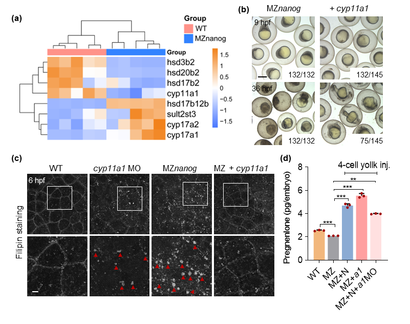 在最新发表的这篇论文中,研究团队发现胆固醇侧链裂解酶编码基因cyp11a1在nanog突变体的卵子和早期胚胎中的转录水平急剧下调,有趣的是,简单过表达cyp11a1即可有效拯救nanog突变体胚胎发育的外包异常、致死性发育缺陷和胆固醇异常累积(图1)。