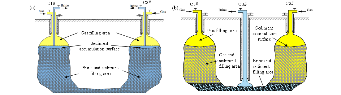 图1 高杂质盐矿U型盐穴:(a)传统的注气排卤技术(沉渣面以上排卤)VS (b)新型注气排卤技术(沉渣体底部排卤)