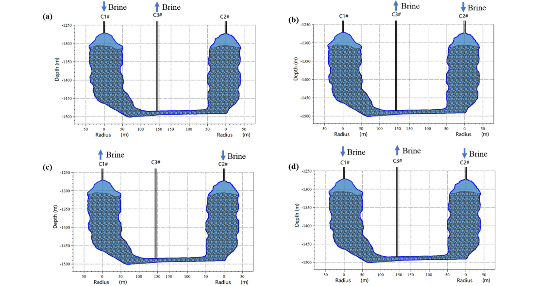 井神公司某高杂质U型盐穴,85%以上的空间被沉渣占据,属于典型的高杂质盐矿采卤溶腔。研究团队新钻排卤井打通该U型盐穴水平段(图1b),开展四组“两注一排”或“一注一排”的“注卤排卤”试验(图2、图3)来模拟实际工程“注气排卤”过程,验证盐穴沉渣堆积体水力连通性和可储性。