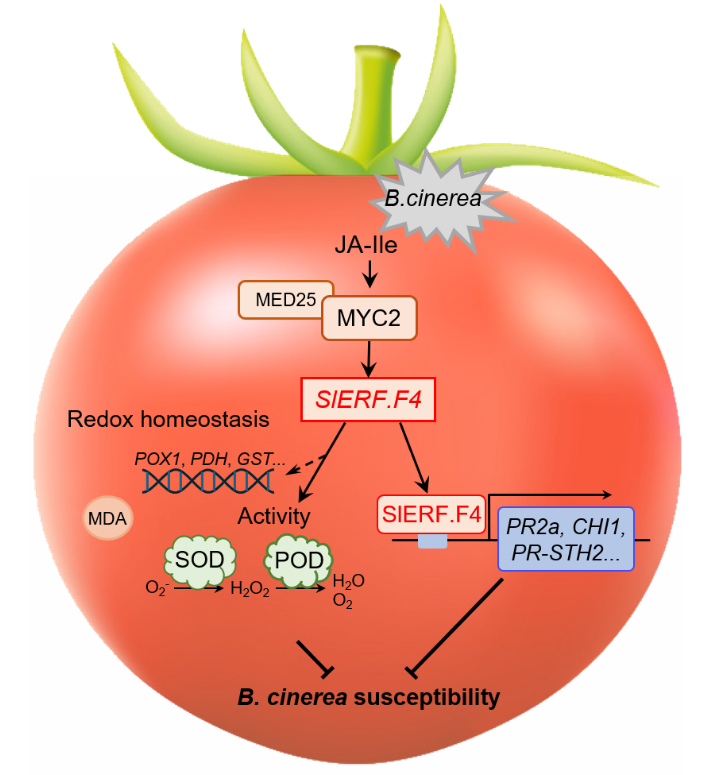 进一步研究揭示,SlERF.F4通过协调PR基因表达和酶促抗氧化活性,在番茄果实的免疫防御与抗氧化防御之间建立了重要的桥梁(图1)。具体而言,经MYC2激活的SlERF.F4能够诱导PR2a、CHI1和PR-STH2等基因的表达,从而直接抵御病原菌。同时,它还通过调控PR-9(POD)和SOD等酶活性,维持活性氧(ROS)稳态,进而抑制氧化损伤。值得强调的是,SlERF.F4在增强番茄对灰霉病抗性的同时,对果实的成熟进程及采后品质均无不利影响,这一特性使其成为培育抗病番茄新品种的理想靶标基因。