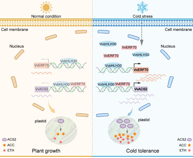 综上,该研究提出了一个完整的VvbHLH30-VvERF70-VvACS2层级调控模块,系统揭示了葡萄低温应答过程中乙烯合成的转录调控网络。该发现不仅填补了葡萄冷胁迫下乙烯合成调控机制的空白,也为精准提升葡萄及其他作物抗寒性提供了新思路和分子靶点。