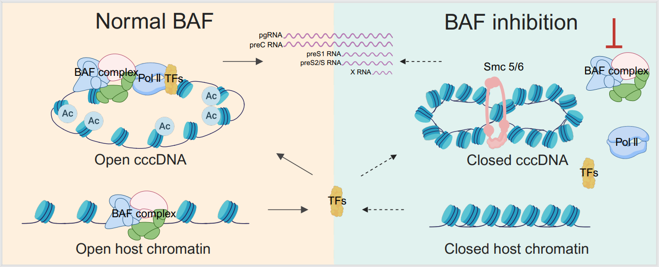 2026年2月10日,中国科学院武汉病毒研究所裴荣娟/陈新文团队联合广州国家实验室范小英团队在学术期刊Nucleic Acids Research上发表了题为“Chromatin remodeler BAF maintains HBV cccDNA transcriptional competence and represents a therapeutic target”的研究论文,探讨了BAF复合物对cccDNA的转录调控机制。