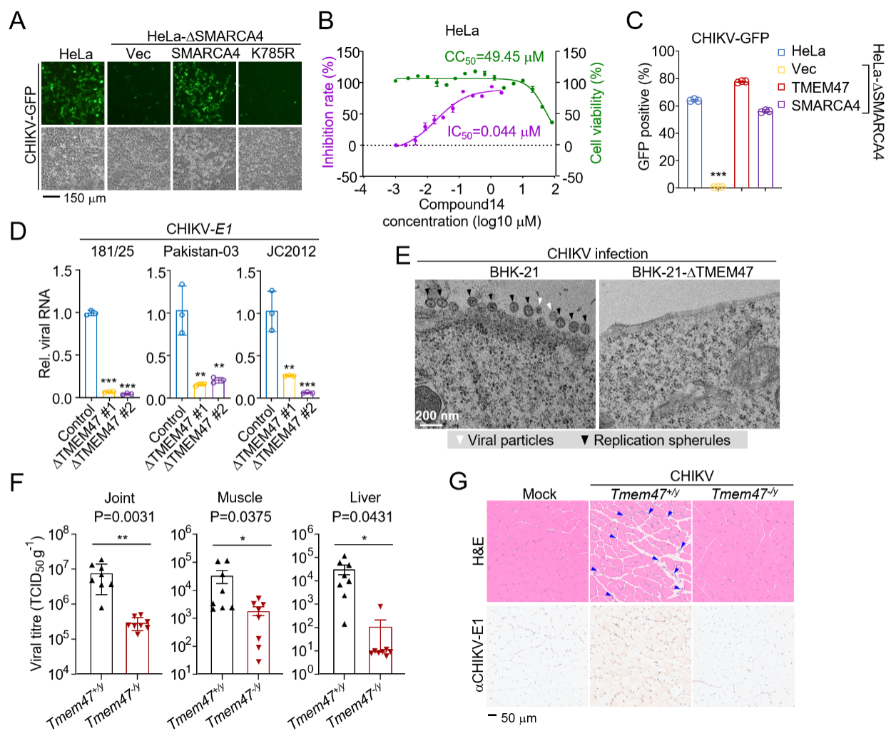 研究团队利用CRISPR-Cas9策略筛选了CHIKV感染所需的关键宿主因子,发现染色质重塑复合物关键ATP酶亚基SMARCA4是CHIKV的重要宿主因子,靶向SMARCA4 ATP酶活的小分子抑制剂能够抑制CHIKV的感染。进一步研究发现,SMARCA4不直接影响CHIKV的复制,而是通过上调四次跨膜蛋白TMEM47的表达间接促进CHIKV的复制。在SMARCA4敲除的细胞中,异源表达TMEM47可完全恢复CHIKV的复制。机制研究证明,TMEM47可与病毒基因组RNA及非结构蛋白nsP1直接相互作用。nsP1是复制复合体的关键组分,负责复制复合体在细胞质膜上的锚定。研究表明TMEM47通过调控细胞质膜上肌动蛋白的聚集参与CHIKV诱导的宿主细胞膜重塑,进而促进病毒复制球的产生,为CHIKV基因组复制提供独立区室。体内研究结果表明,TMEM47-/-小鼠感染CHIKV后,肌肉、关节和肝脏中的病毒载量显著降低,感染导致的病理损伤明显缓解(图1)。这项研究揭示了SMARCA4-TMEM47调控CHIKV复制的重要机制,为防治策略的开发奠定了科学基础。