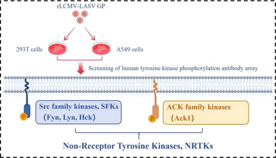 拉沙病毒(LASV)等沙粒病毒具有高致病性,严重威胁全球公共卫生安全。由于相关研究必须在生物安全四级实验室开展,极大制约了致病机制解析与抗病毒药物研发进度。为此,团队以模式沙粒病毒淋巴细胞性脉络丛脑膜炎病毒(LCMV)为研究体系,系统评估宿主Src家族激酶在病毒生命周期中的功能,并依托武汉病毒所P4实验室,在活的拉沙病毒上完成关键机制验证。